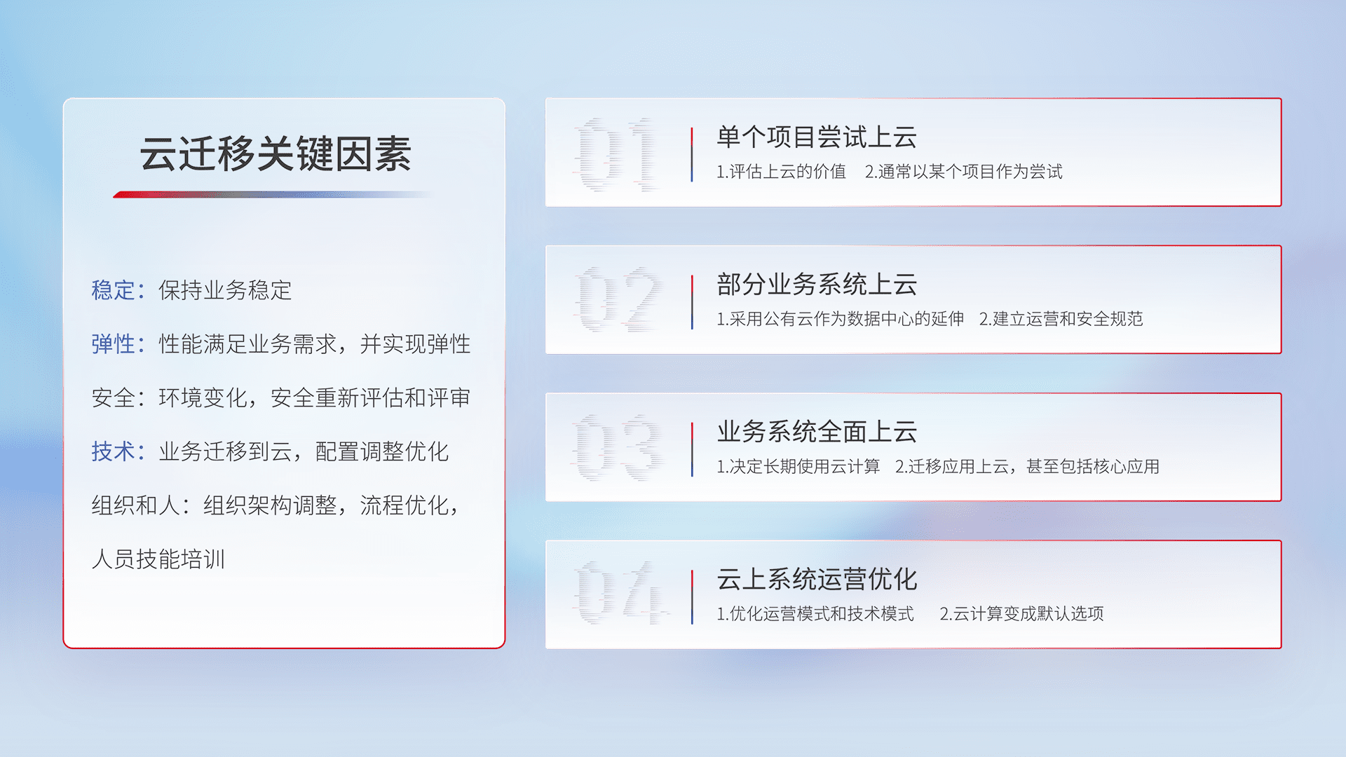 结合实际业务,,,,从规划设计、、云平台选型、、、、云原生改造、、、数据迁移、、集成交付,,,迁移全过程为客户识别最佳上云路径,,,做好风险识别管理,,,设计网络架构、、、身份权限、、、安全审计合规、、、、操作审计、、、、日志审计、、、、监控告警策略、、多站点容灾设计等,,对云上基础设施进行整体规划,,提升IT治理水平,,,以满足弹性、、、高可用、、高性能的需求。。。。