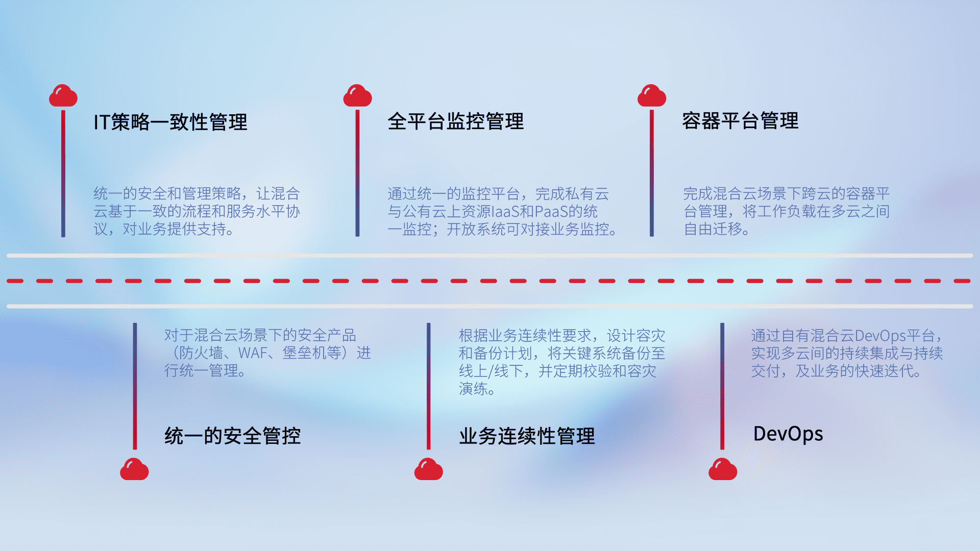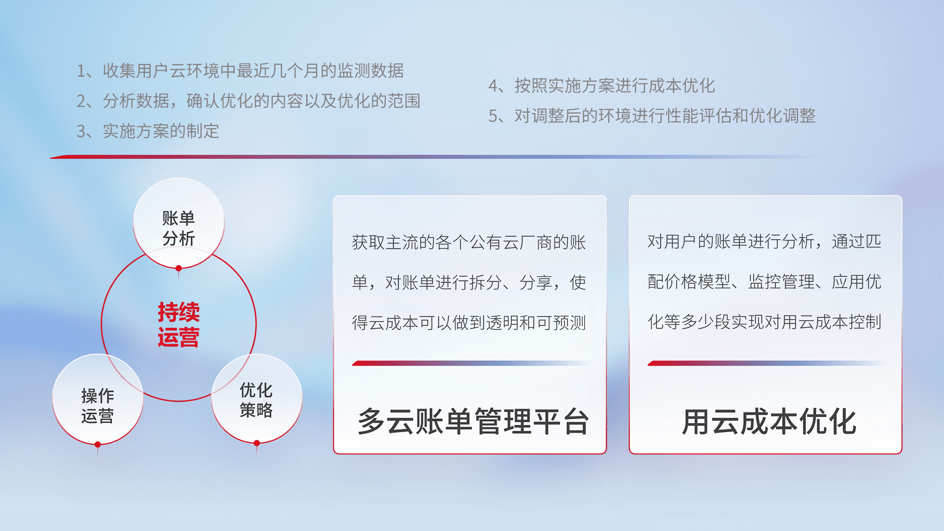 通过多云纳管,,,,以统一的资源数据模型把客户的云资源进行抽象和封装,,进而实现对多云资源的统一操作,,,保障云资源管理的可靠性、、、稳定性与可用性。。量身定制化运维内容,,配置、、、开发运维、、补丁管理、、、、备份、、、、监控、、、、认证和访问管理、、审计和日常巡检等,,,,保障在用云过程中的可靠度,,,稳定度以及高可用率。。。。